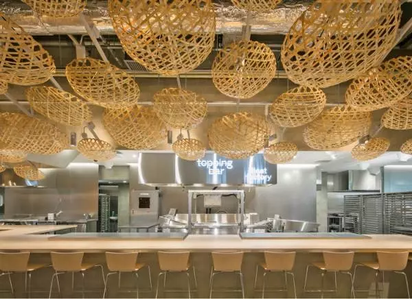 建築家・隈研吾氏による店舗デザインは、京都の繊細でたくましい台所文化を竹かごでイメージ。