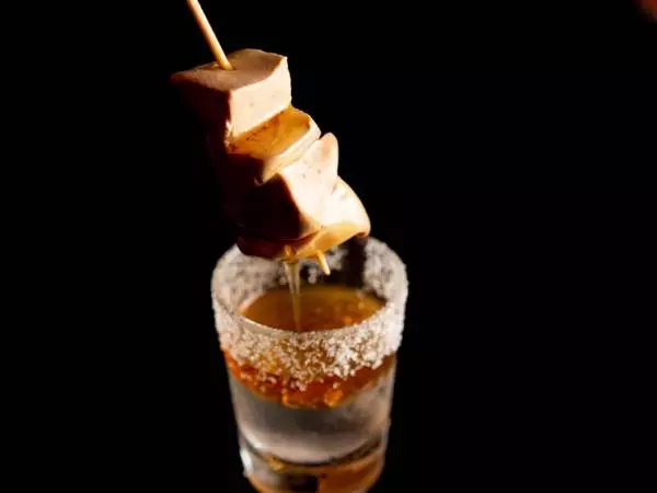 コースの一品『レバー刺し』は、その見た目から味わいまで驚きの連続。好みのかたさに塩梅して、胡麻油と塩水入りのショットグラスで提供され、風味・柔らかさ・味のすべてで新しい食体験が楽しめます。