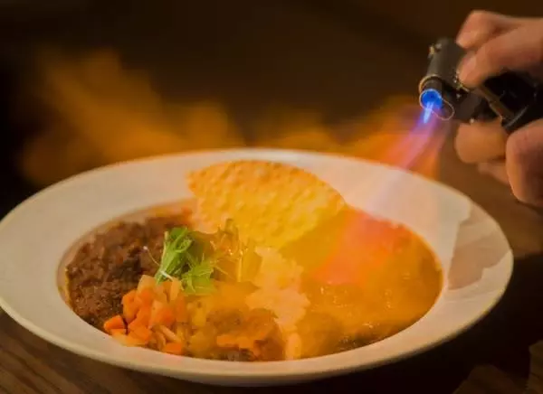 ポークキーマ『マーラ』1,300円(税込)ともう一つはメキシカン風『モーレ』1,300円(税込)の2種盛り1,600円(税込)。最後に八角の香りのアブサンやテキーラの香りを炎とともに吹きかけるサプライズの演出も