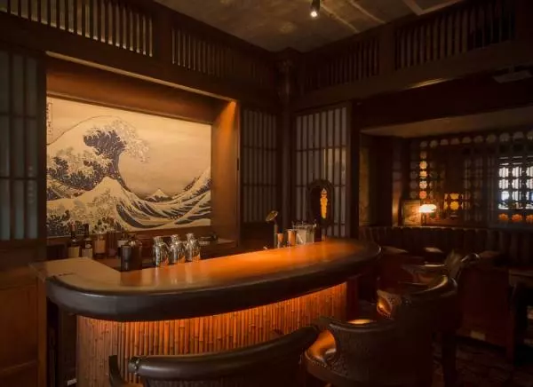 葛飾北斎の『富獄三十六景』のうち7枚が掛かるシガーバー。水場であるカウンターバックには「神奈川沖浪裏」と、シチュエーションも考慮してのセレクト。そのこだわりにもウイットを感じる