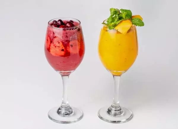『AYAドリンク』は2種。「ミックスベリースムージー」972円(左)、「マンゴーとチアシードのMIXジュース」1,296円(ともに税込)。※BBQセットには含まれておりません、アラカルトのみの販売