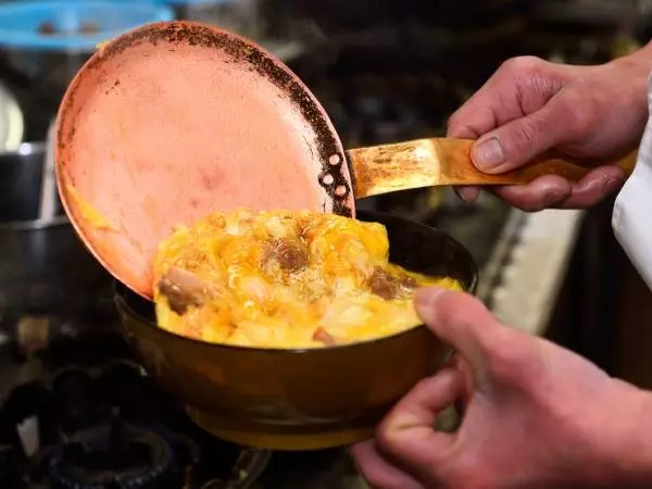 1760年創業。将軍家の御前で、鷹がとらえた鶴を捌く「御鷹匠」を務めた初代・山田鐵右衞門が、鳥すき(軍鶏)専門店として開いたのが【玉ひで】の始まりです。『親子丼』発祥の店としても知られており、5代目女将“とく”がその考案者。鶏肉と卵を調理して丼ぶりにのせる親子丼は以前もありましたが、『鳥すき』の割下で鶏肉を煮て卵でとじる、現在の親子丼のスタイルを生みだしました。
