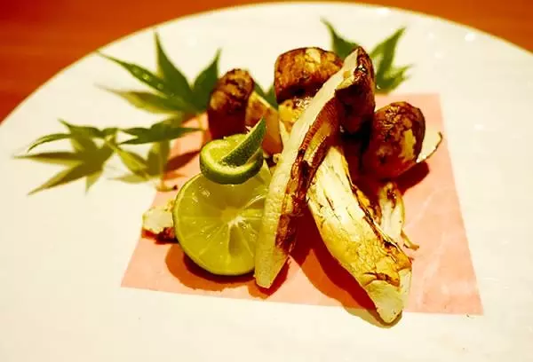 そして秋の味覚『焼きマツタケ』が登場。テーブルに運ばれてきた瞬間、鼻腔をくすぐる松茸の馥郁たるの香りがたまりません。厚くカットされた肉厚のマツタケは、見た目から贅沢! 味付けは塩のみで、噛むほどにマツタケの旨味をダイレクトに堪能できます。お好みでスダチや出汁で割った、割りポンで味わうのもおすすめです。