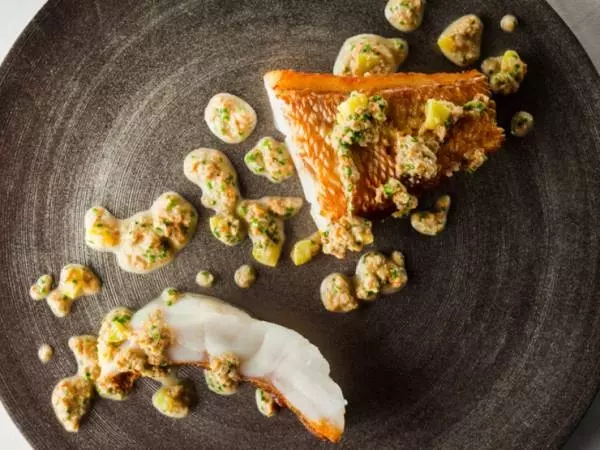 皮と身の食感がたまらない『カサゴと甘鯛ジロール茸とシャンパンビネガーと銀杏のソース』