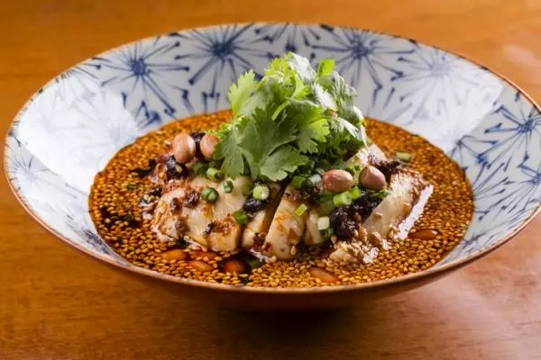 お次は、江南料理を中心とした伝統名菜をスタイリッシュに提供する【JASMINE憶江南】より、よだれ鶏をご紹介。『JASMINE名物“よだれ鶏”蒸し鶏の特製香ラー油』は、湯を沸騰させずに煮込むことで、総州古白鶏の豊かな弾力を引き出しています。香辛料を複雑にブレンドした特製香ラー油と黒酢の、ほど良い刺激と深い香りが楽しめます。