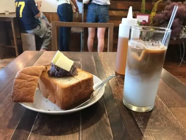 名店の食パンをつかった絶品『あんバタートースト』550円(税抜)、しっかり苦味のあるエスプレッソで作られた『カフェラテ』500円(税抜)