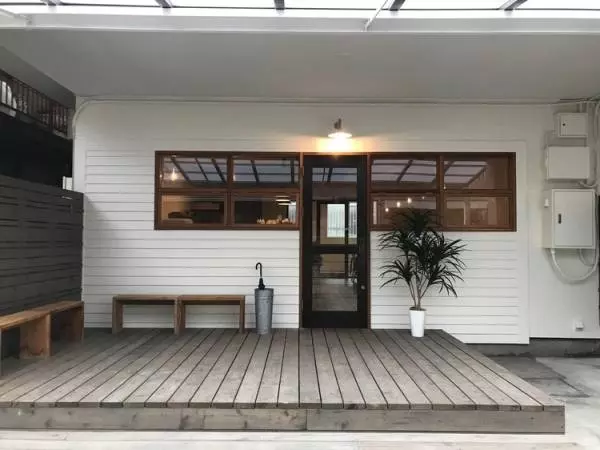 ウッドデッキになっている入り口。テーブル席でゆっくり休むことができ、奥にはワークショップやギャラリーなどで使用するエリアもある