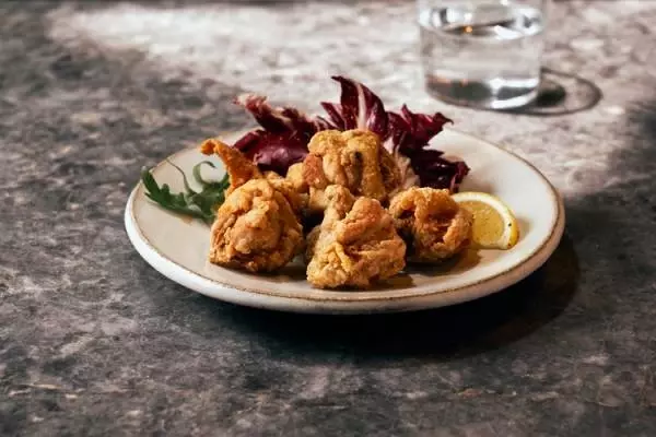 一歩店内に足を踏み入れれば、右手にはギャラリーが広がる。階段をあがると、打ちっ放しコンクリートが印象的なグレーのスタイリッシュな2階のバーにたどり着く。この、秘密基地で食べる飯がまた旨い。