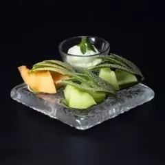 メニューで使用するメロンには、クラシック音楽の巨匠のうちロマン派と呼ばれるショパン、シューマン、メンデルスゾーンといった作曲家の音楽を聴かせています。クラシック音楽を聴かせたフルーツは、より一層おいしくなるという説があり、そのロマンを追求しています。「触る」- メロンの網目の凹凸をコースターで表現した“メロンを感じるコースター”