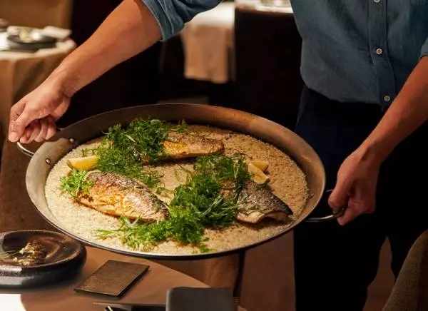 サービスで振舞われる大鍋のパエリア。この日の具材はサバとミックスハーブ