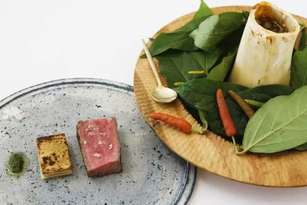 主菜は、もとぶ牛を炭の上でゆっくり転がしながら焼くジューシーなロースト。付け合わせはパパイヤの酢漬けと発酵させたバナナ、スライスしたターム(タロイモ)を重ね、バターでコンフィしたほのかに甘いミルフィーユ。