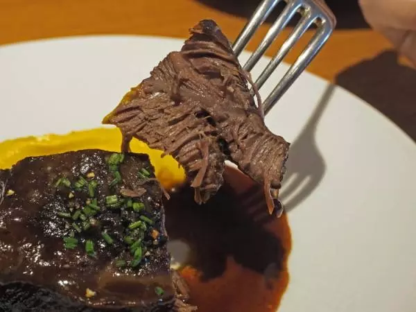 ほどける肉の旨みと芳醇な赤ワインソースのコクが仲良く手を取り合い、深い味わいを醸しながらダンスするかのような美味しさ。さらに付け合わせのニンジンのピューレと絡めれば、それがまたまろやかな甘みのソース代わりとなり、味にアクセントと深い余韻を残します。
