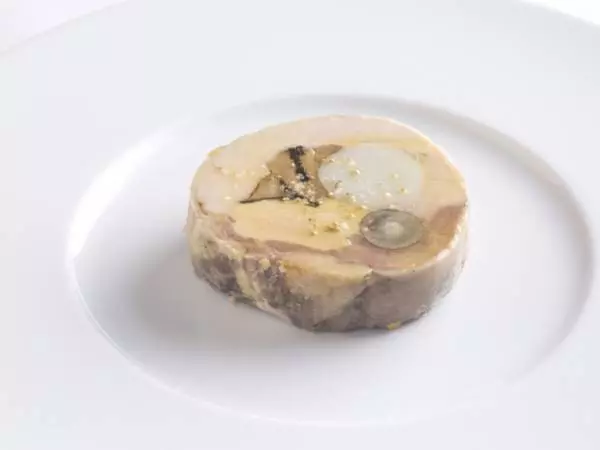 さまざまな食感、味わいが楽しい『ホロホロ鳥 フォワグラ 里芋 木の子 牛蒡のガランティーヌ』