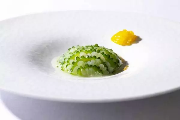 「遺産、工芸、伝統」のテーマでアンドレがつくった『ニガウリとシリアル』。軽くマリネしたゴーヤの下には、鶏のだしで炊いた冷たいおかゆが隠れている。塩卵の黄身のクリームを添えて