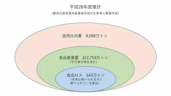 食糧の廃棄というと「食品ロス」という言葉が一般的ですが、これは「本来食べられるのに捨てられている食品」を指しています(農林水産省による定義)。流通過程での売れ残りや規格外品、購入したけれど使い切れず品質が劣化した食品、家庭やレストランでの食べ残しなどがその代表的な内容で、農林水産省による平成28年度の推計では、日本は年間643万トン、一人当たりにすると51㎏もの食品ロスを生み出しています。