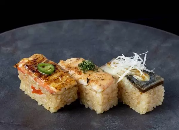 押し寿司にオリジナルソースを合わせてカスバーナーで炙るスタイルで、日本のお寿司と言うよりは、外国人でも食べやすい洋風の味付けです。1番人気は、脂の少ない紅鮭にオリジナルソースを合わせて炙った『炙りサーモン押し寿司』。