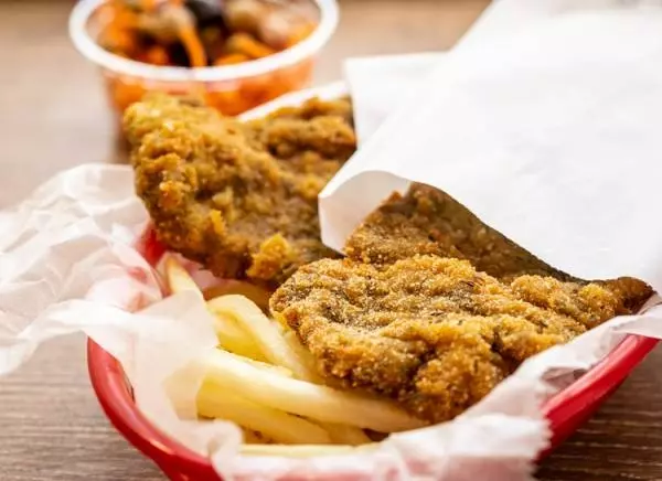 ショルダー、レッグ、ロース、肩ロース、ランプの5種類の部位があり、提供は日によって変わります。注文後に秘伝ブレンドのスパイスをまぶし、1分半ほど揚げて完成