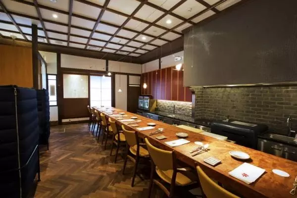 京町屋を改装した趣がありつつもスタイリッシュな内装。シェフを身近に感じるオープンキッチンのカウンターには名作椅子が並び、ゆったりと料理を楽しめる心地のいい空間
