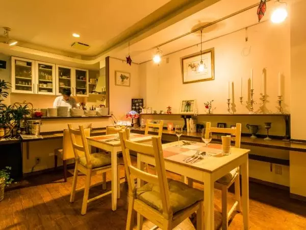 路地の一角にひっそりと佇むカフェ。白を基調とした店内は、やわらかな雰囲気を醸し出します。オープンキッチンなので、カウンター越しにシェフとの会話が楽しめるアットホームな空気も魅力。