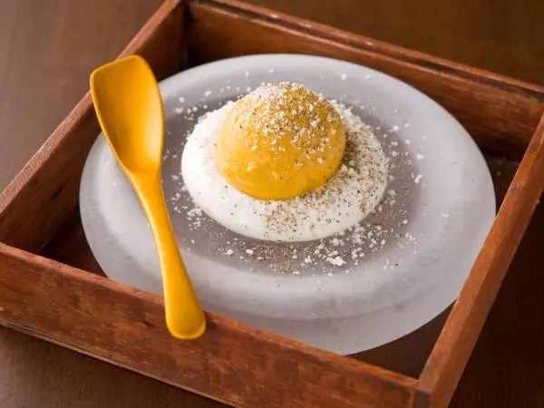 酸味の効いたソルベにムース状のココナッツをトッピングした『冷たい目玉焼き』900円(税抜)。仕上げに胡椒をぱらり