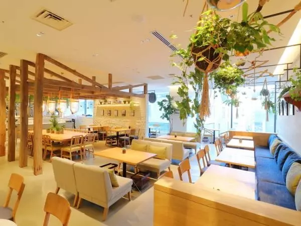 白を基調とした内装は、南カリフォルニアをイメージ。店内にあしらわれた古木やグリーンなど、自然の風合いから伝わってくる温もりが、居心地の良い空間を演出します。夜になると照明を優しく灯すことで、フロアはシックな印象に様変わり。リラックスムードもより高まり、長居したくなるのも頷けます。