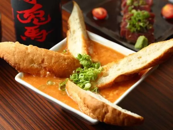 プリプリのエビと揚げナスを自家製のチリソースでいただく『チーズエビチリフォンデュ』。スープ状のチーズがコクとまろやかさをプラス