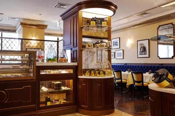 【Café Cova Milano GINZA SIX】はミラノの旗艦店を再現。アンティークミラー、ビロードのソファー、クリスタルのシャンデリア、金色の縁と真鍮で仕上げられた天然大理石を使ったオリジナルの洗練されたマホガニーのカウンターを設置し、ラグジュアリーで落ち着いた雰囲気の中でカフェや食事が楽しめます。