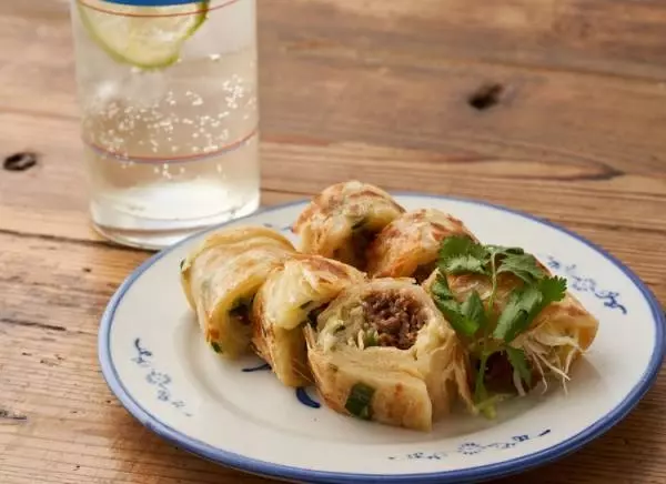 牛肉とチーズという鉄板の組合せを葱入り生地で巻いた『葱油餅の牛肉巻き』850円(税抜)