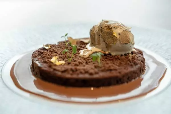 アシェットデセールタイムの看板メニューがこちらの『ショコラ・ロワイヤル』。トリュフを贅沢に使用したバニラアイスにフォアグラのクリームを合わせるなど、まるでフランス料理のようなデセールです。