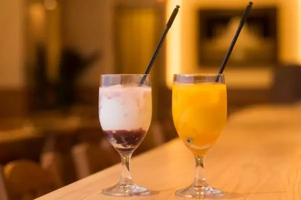 左:自家製ラッシーカクテル(カシス)600円、右:自家製ラッシーカクテル(ピーチ)680円(共に税別)。1年にカレーを8000色食べるという料理研究家の一条もんこさんが監修