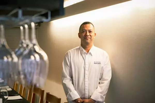 【BISTRO HiNGE(ビストロヒンジ)】のシェフを務めるのは、田村匡史(たむらまさのぶ)さん。19歳で料理人になり、以来、ホテルのレストランを中心に研鑽を積んできました。4年半ほど汐留パークホテルの【タテル ヨシノ ビズ】で腕をふるったあと、2019年6月27日にスーシェフの上野健高さん、シニアソムリエの中田康夫さんとともに【ビストロヒンジ】をオープンしました。