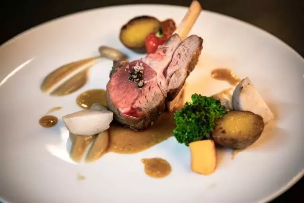選べるメイン料理のひとつ『軽くスモークした骨付き仔羊のロースト こだわり野菜添え』。