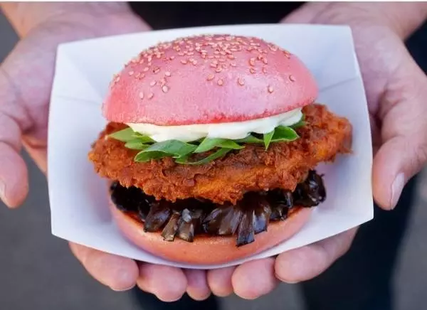 秋が旬のビーツを生地に練り込み、ほんのりとピンクに色づいたブリオッシュパンをバンズに使用した、スペシャルなコラボバーガーが完成したのです!