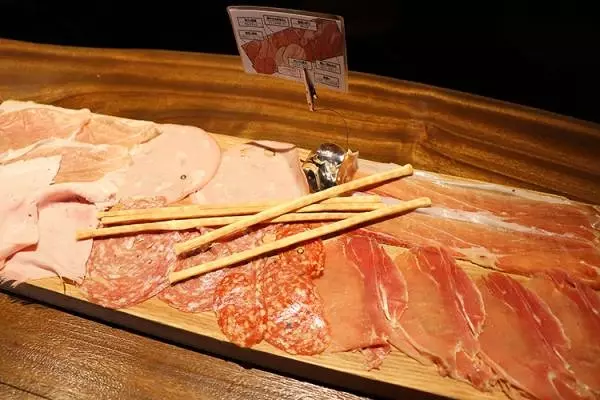 15種の切りたての生ハムとサラミを食べ比べできるバル。「盛り合わせ」が人気
