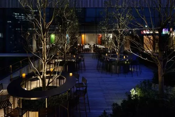 東京のビル群を眺める開放的なテラス席で、500円ワンコインから気軽に店の味が楽しめる