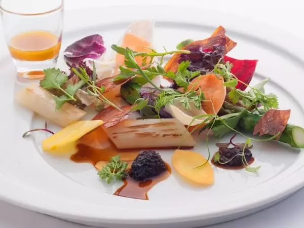 料理は「洗練された野菜の美食」がコンセプト。定評があるメニューは、『野菜の遊園地』をはじめとした、美食と健康が一皿に共存する野菜たっぷりのフレンチです。バター・生クリームなどの使用を極力避けた、ヘルシーな新スタイルのガストロノミーが魅力です。