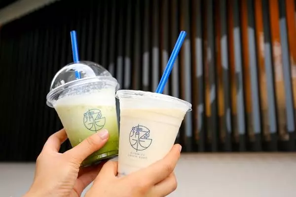 (右)『チーズドリンク』400円(税抜)と、抹茶ミルクとチーズフォームの二層仕立ての(左)『チーズティー』400円(税抜)