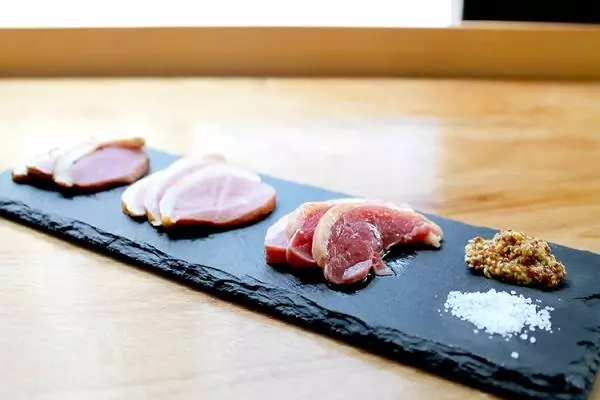 ビールと合わせたい、肉系のメニューも充実しています。単品でもオーダーできる鴨肉を盛合せたメニューは、写真手前から生ハム、スモーク、パストラミ。岩塩とマスタードが添えられています。