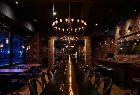 レンガ造りを基調としたシックな店内。カウンター席、テーブル席トータル49席