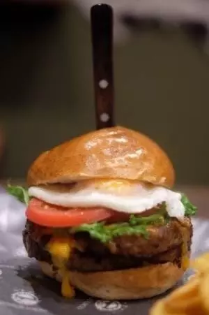 具材が今にもこぼれ落ちそうなハンバーガーのてっぺんにはナイフが。テーブルに運ばれてくる際のインパクトは圧巻!