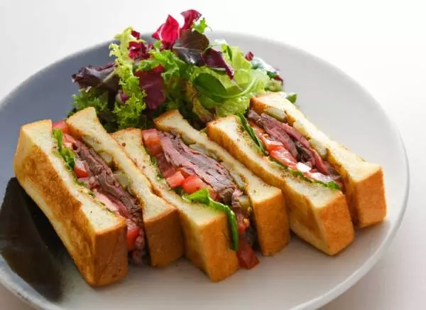 マンゴーのデミグラスソースが絶妙。『ローストビーフサンドイッチ(果実のスープ付)』 2,420円(税込)