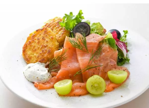 クリームチーズがアクセントに。『スモークサーモンと果実のサラダ、 じゃがいものガレット添え(果実のスープ付)』 1,980円(税込)