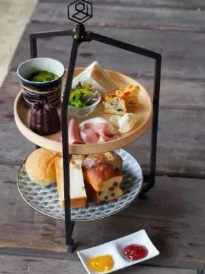 パン5種、ハム、チーズ、サラダ、ケークサレ、抹茶のティラミス、カヌレ、フルーツサラダなどをたっぷり盛り込んだ『ブランティーセット』2,300円(税込)