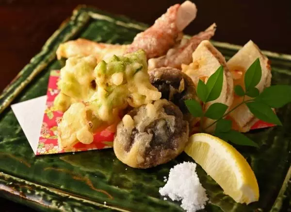 3種の米粉をブレンドした衣をつけて、旬菜、魚介、肉を揚げ、サクサク軽い食感に仕上げた『米粉天ぷら』