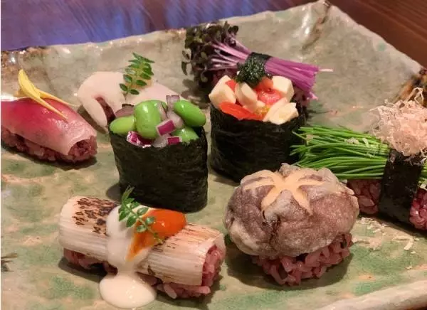「よくある野菜寿司ではなく、ちょっとおもしろいものにしたかった」と、個性豊かな赤シャリの寿司もスタート!赤酢と黒米の鮮やかな赤シャリの上には、色とりどりの野菜が並びます。