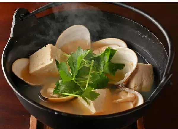 鹿児島南大隅町の無薬畜養のはまぐりを使用。2~3人前 2,800円(税抜)、活はまぐり6個、絹豆腐1丁、切り三つ葉