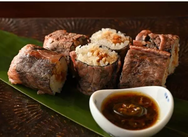 ねぎトロ、糀納豆などを具にした海苔巻きを、黒毛和牛の増田牛で巻いて炙った肉巻き。850円(税抜)