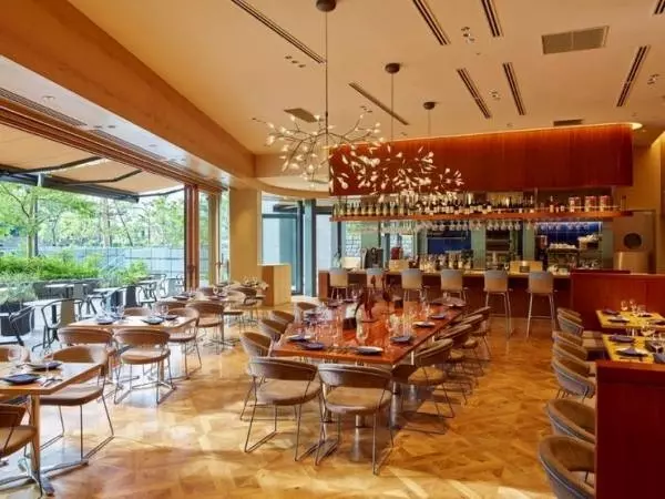 四季を感じる中庭が目の前に広がる開放感あふれるブラッスリー。そんな洗練された空間には、オープンキッチンを眺めるカウンター席やセンターテーブルが配され、クリスマスだけでなく、ランチや喫茶としてビジネスマンも利用しやすい雰囲気です。