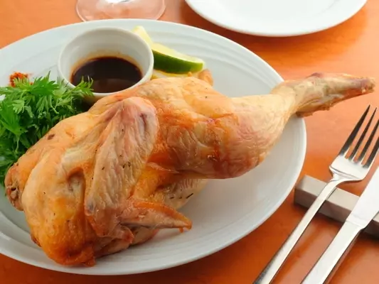 やわらさと歯ごたえが特徴の錦爽どりをハーブソルトに漬け込んで風味付け。低温でじっくりと焼いた一皿です。