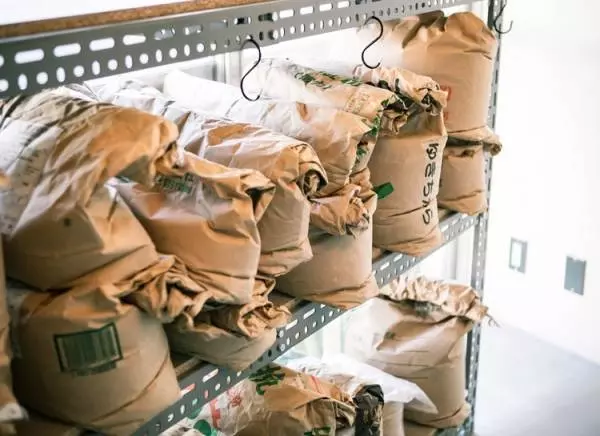 店内の棚には小麦粉の入った袋がずらり。今は8~9種類の小麦を使い分けている